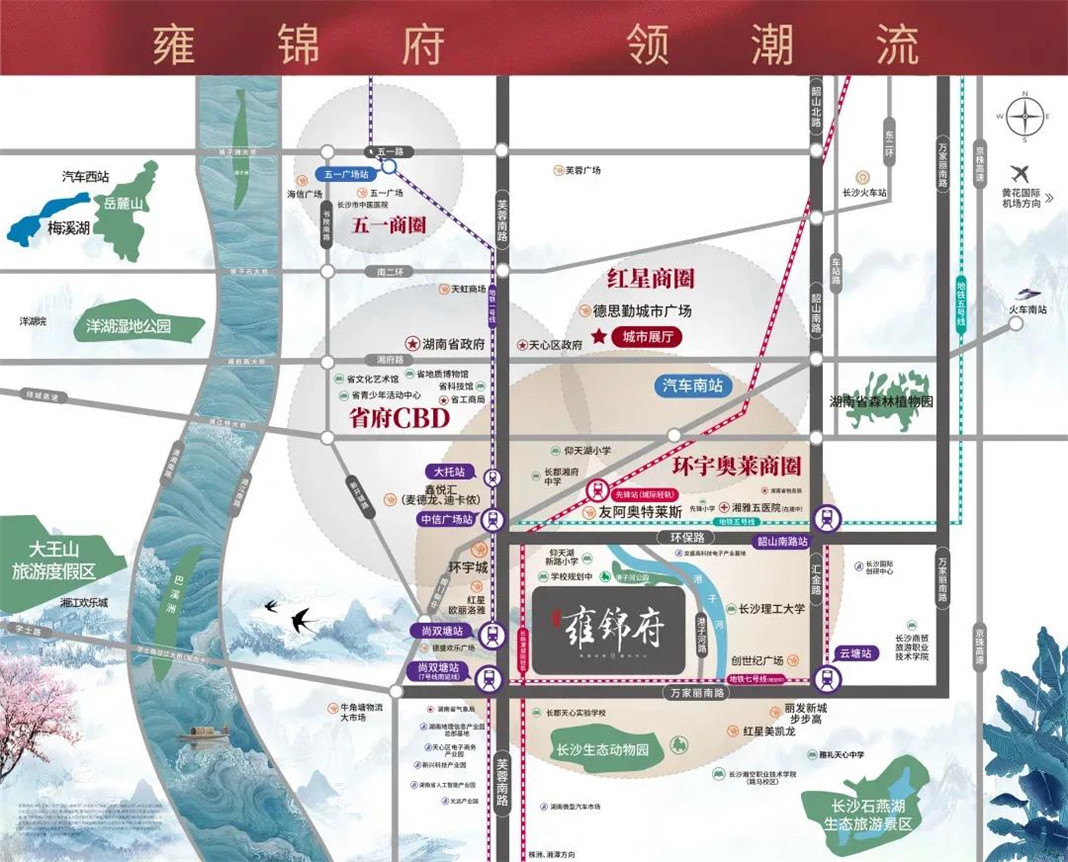 【交通】: 省府南板块是整个长沙市地铁覆盖率最高的区域(规划地铁1号线、5号线、7号线、12号线) 是整个长沙市快速干道最完善的区域(湘府路高架、万家丽高架) 是长株潭跨市交通系统最便捷的区域(长株潭城轨、长株快线),交通系统全面升级,实现枢纽融城。