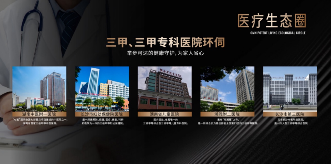 5所三甲医院:湖南省中医附一医院、长沙市妇幼保健院、湖南省儿童医院、湘雅附二医院、长沙市第三医院,举步可达。